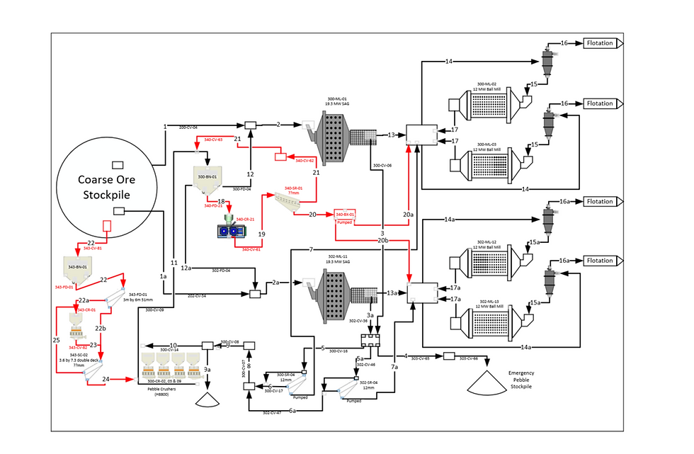 Following a 5 year ramp up period and several flowsheet modifications, plant throughput at Goldcorp’s Peñasquito operations was still well short of its 130,000 tpd nameplate in 2014 (109,000 tpd). The comminution flowsheet had become very complex (SABC with secondary crushing and a HPGR on crushed pebbles) and due also to some poor design features, the operations team had been unable to ramp up to design throughput. Goldcorp therefore engaged Chemech to provide an independent assessment of the process plant throughput capability and to propose options for optimisation and debottlenecking. Chemech developed complex models using plant data to identify the throughput bottlenecks and assess the impact of their proposed optimisation and debottlenecking options. Based on this analysis, Chemech proposed a low-capex optimisation program aimed at improving the control, operation, and availability of the major equipment to increase throughput to 90-95% of nameplate. The information gained during the optimisation phase could then be used to aid the selection of options to debottleneck the plant and further increase its capacity to 100-105% of nameplate. Chemech then provided high-level expansion options to increase throughput beyond 115% of design throughput.